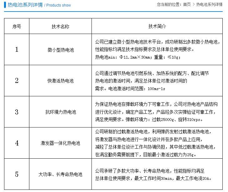 公司主营产品为热电池及智能电源,目前已开发热电池130余种,智能电源30余种。其中定型产品12种。已承担了兵器、航空、航天、船舶等多领域武器系统热电池、智能电源的研制与生产任务,产品覆盖海、陆、空、二炮、装甲兵等多兵种。公司以强军报国为己任,以先进的管理模式、可靠的军工品质、高效的研发团队、优质的客户服务理念致力于新能源及国防装备制造事业。