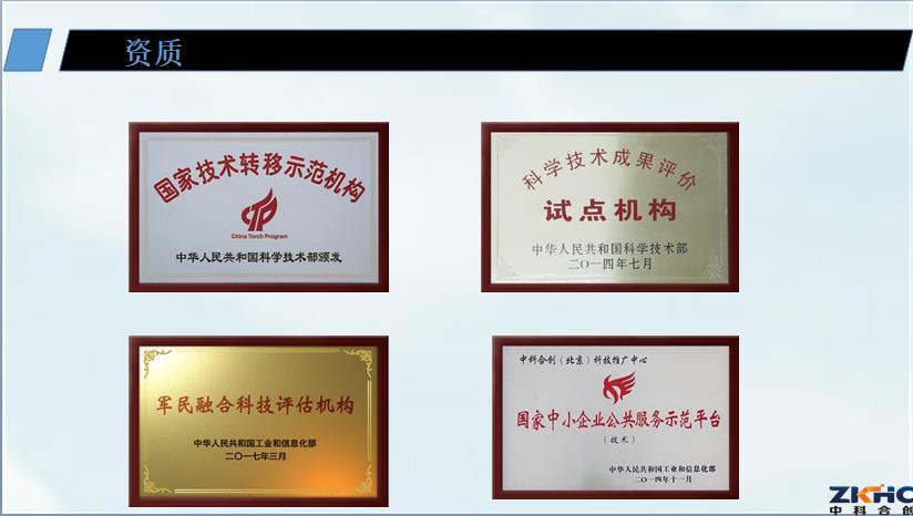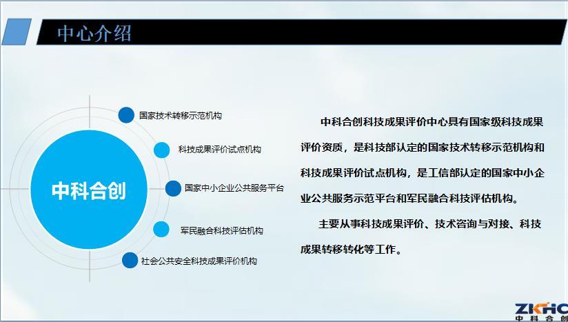中科合创科技成果评价中心具有国家级科技成果评价资质,是科技部认定的国家技术转移示范机构和科技成果评价试点机构,是工信部认定的国家中小企业公共服务示范平台和军民融合科技评估机构。